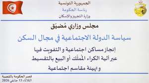 أشرفت رئيسة الحكومة السيدة سارّة الزعفراني الزنزري اليوم الثلاثاء 13 جانفي 2026، بقصر الحكومة بالقصبة، على مجلس وزاري مضيق حول سياسة الدولة الاجتماعية في مجال السكن والمخطّط التنفيذي الخاص بإنجاز [...]