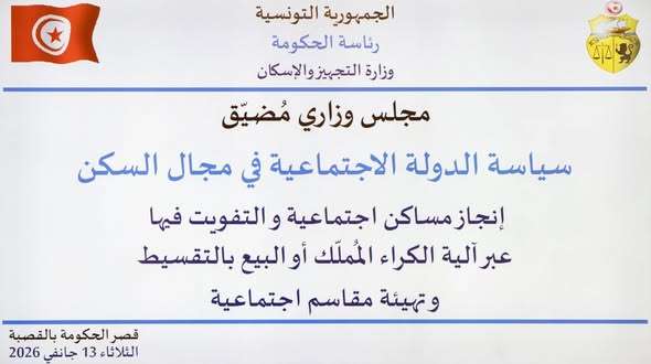 أشرفت رئيسة الحكومة السيدة سارّة الزعفراني الزنزري اليوم الثلاثاء 13 جانفي 2026، بقصر الحكومة بالقصبة، على مجلس وزاري مضيق حول سياسة الدولة الاجتماعية في مجال السكن والمخطّط التنفيذي الخاص بإنجاز مساكن اجتماعية والتفويت فيها لفائدة الفئات محدودة ومتوسطة الدخل، عبر آلية الكراء المُملّك أو البيع بالتقسيط وتهيئة مقاسم اجتماعية.