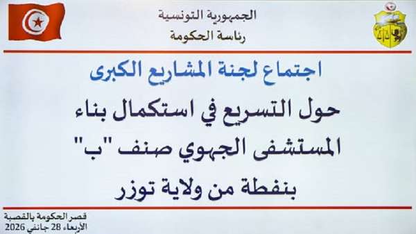في إطار التسريع في نسق تقدّم كلّ المشاريع العمومية، انعقد مساء اليوم الأربعاء 28 جانفي 2026 بقصر الحكومة بالقصبة اجتماع لجنة المشاريع الكبرى بإشراف رئيسة الحكومة السيدة سارّة الزّعفراني الزّنزري، للنظر في مسار تقدّم إنجاز مشروع المستشفى الجهوي صنف "ب" بنفطة من ولاية توزر وتذليل كلّ الصعوبات التي مرّ بها المشروع.