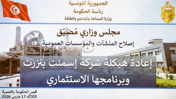أشرفت رئيسة الحكومة السيدة سارة الزعفراني الزنزري اليوم الثلاثاء 17 مارس 2026، بقصر الحكومة بالقصبة، على اجتماع مجلس وزاري مضيق للنظر في إعادة هيكلة شركة إسمنت بنزرت والسبل الكفيلة بإعادة الاستثمار في هذه المؤسسة العمومية باعتبارها من المؤسسات الوطنية الكبرى ذات التاريخ العريق التي تساهم في تطوير قطاع الاسمنت الذي يعدّ أحد القطاعات الاستراتيجية الحيوية في تونس.