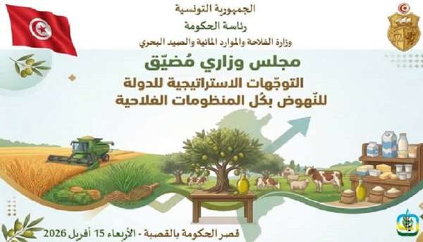 أشرفت رئيسة الحكومة السيّدة سارّة الزّعفراني الزّنزري اليوم الأربعاء 15 أفريل 2026 بقصر الحكومة بالقصبة على اجتماع مجلس وزاري مُضيّق، خُصّص للنظر في تقدّم البرامج المنبثقة عن استراتيجيّة الدولة للنهوض بالمنظومات الفلاحية.
